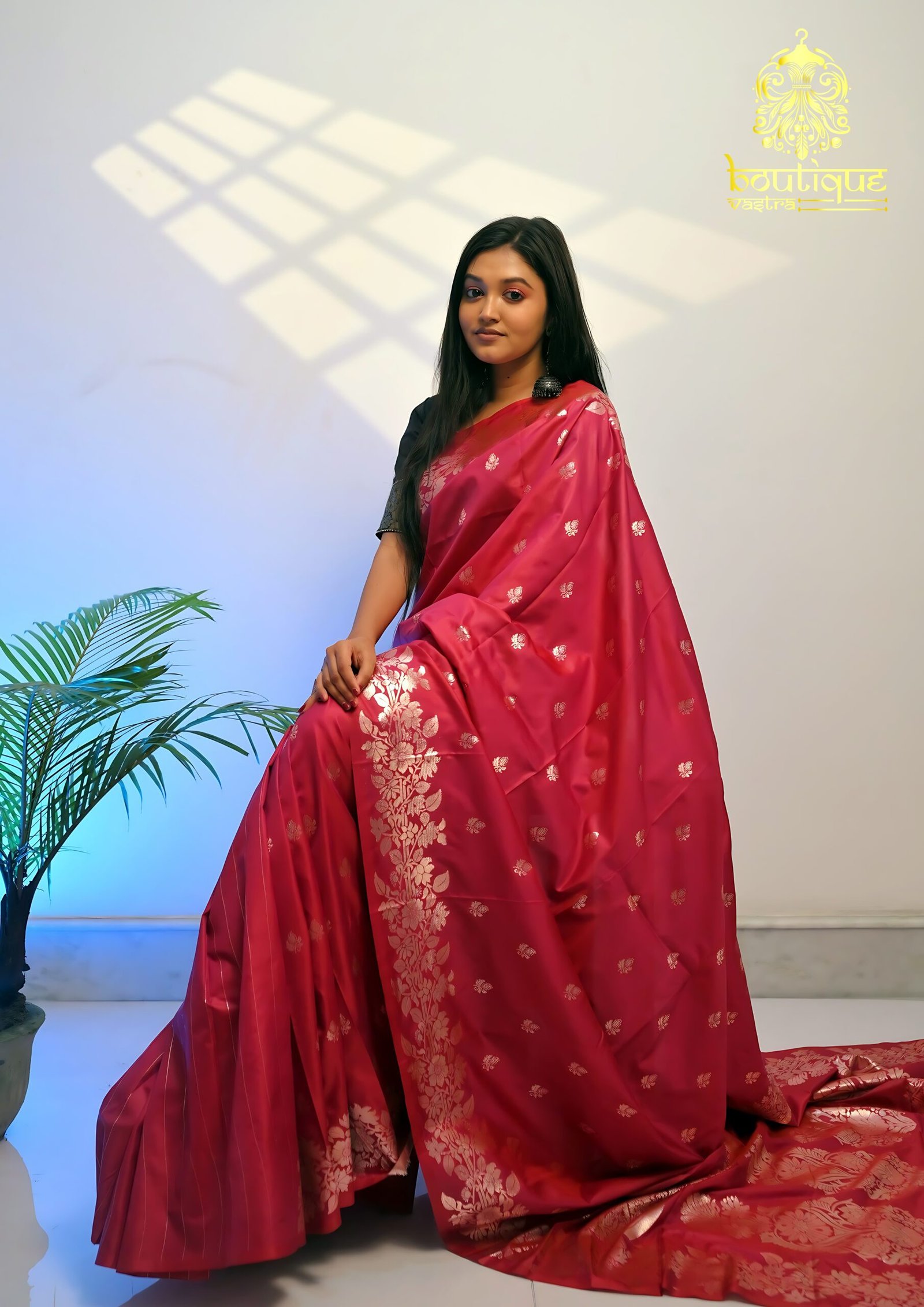 Saree Fabric: Katan Silk Saree Work: Premium Zari Work Saree Colour :Magenta Pink Saree Length: 5.50 mt Blouse Length: 0.80mt Blouse work:Butta Work With Zari Border Wash and Care:Dry wash, Do not dry it direct Sunlight
